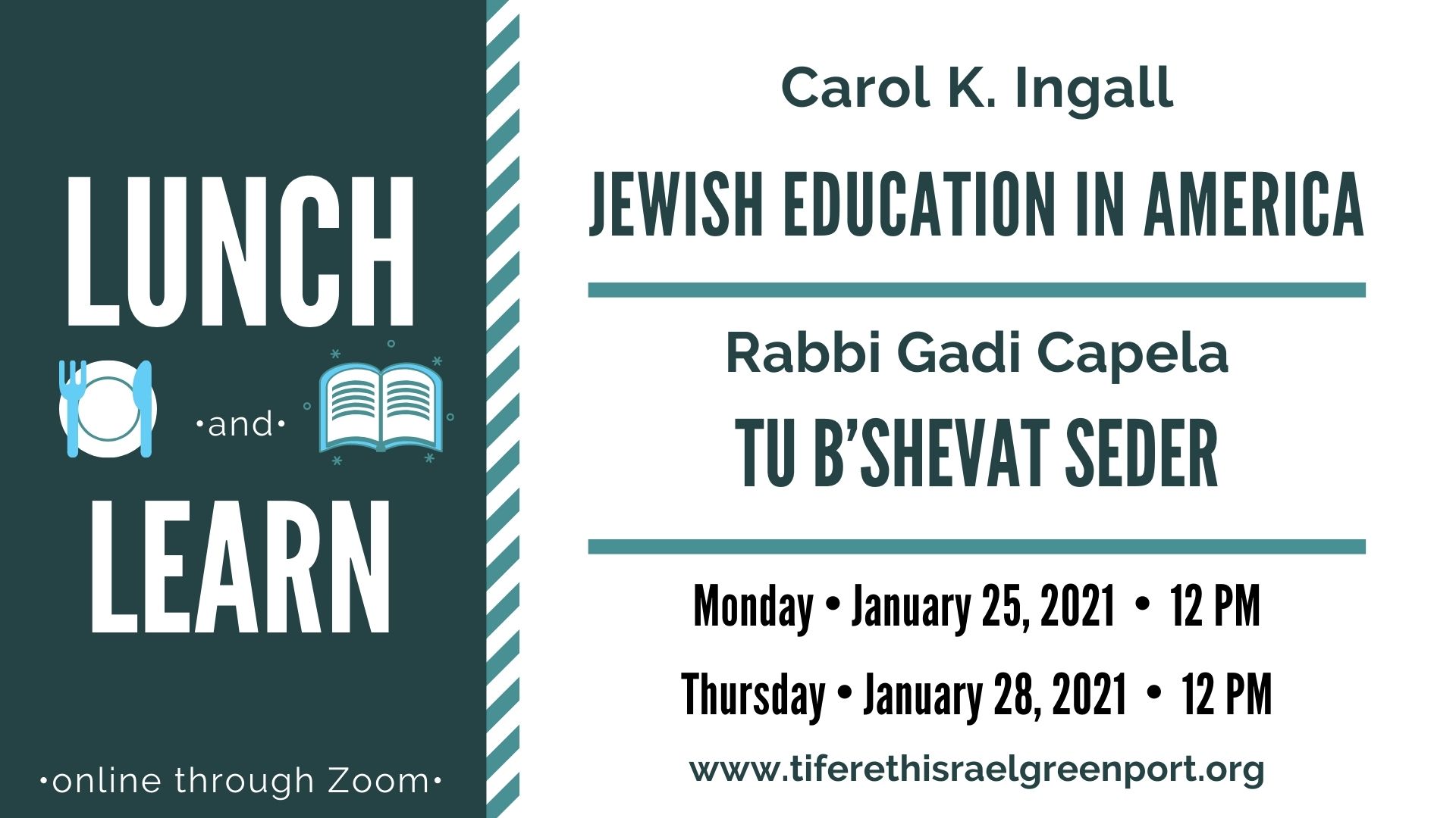Join Lunch and Learn today as we celebrate nature and the holiday of Tu B’Shevat with a seder, led by Rabbi Gadi. As part of the seder, dried fruits and nuts are featured, also the seven species widespread in Israel: wheat, barley, grapes, figs, pomegranates, olives and dates. With songs, prayers, fruits and wine, we will learn the significance of this joyous holiday by appreciating the bounty of this world, and all the ways that trees provide us with food, shelter, beauty and valuable life lessons. Zoom at noon for this special Lunch and Learn.