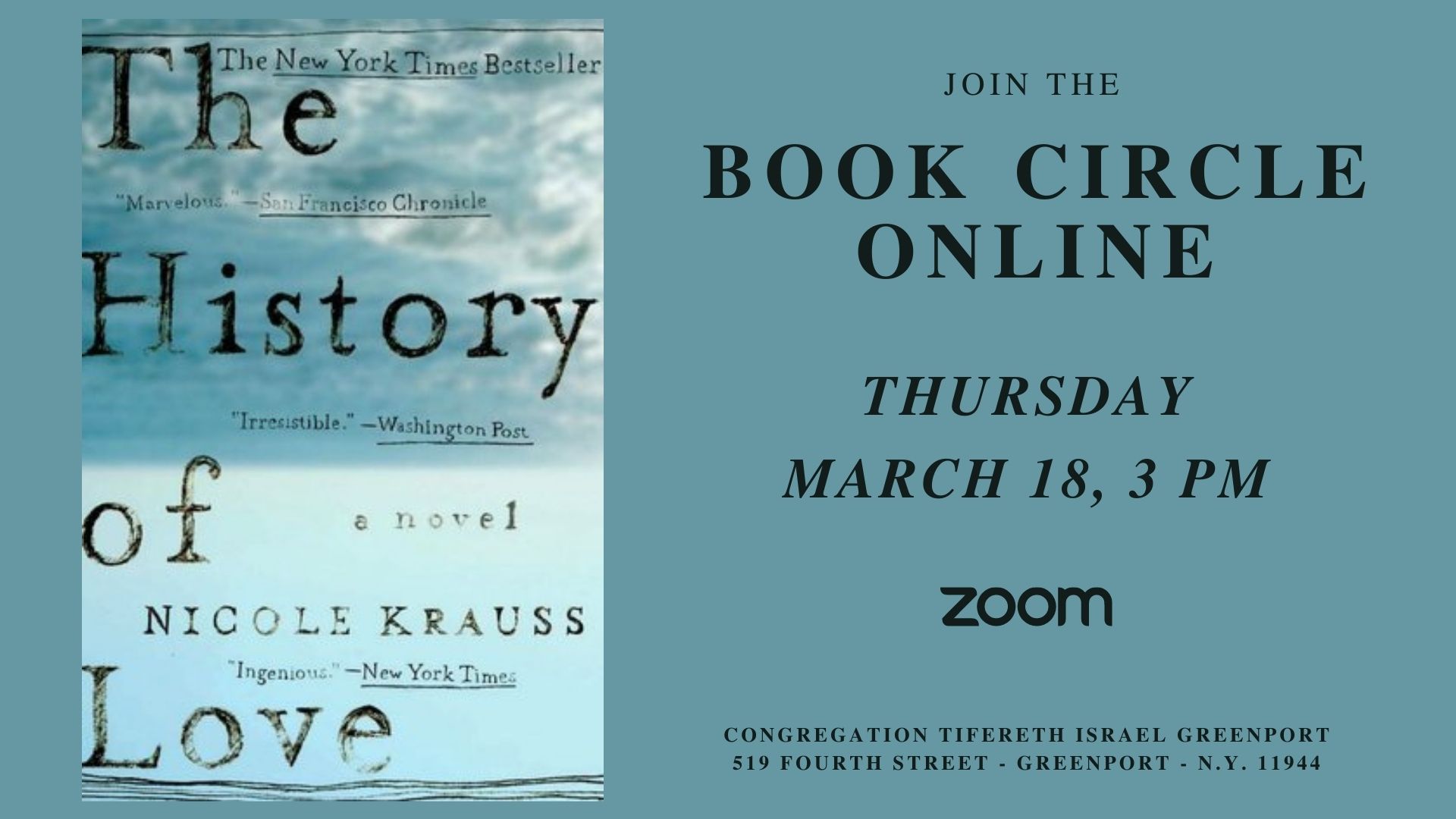 The next meeting of the Book Circle will be held on Thursday, March 18, at 3 p.m., on Zoom. The selection for the month is History of Love by Nicole Krauss.