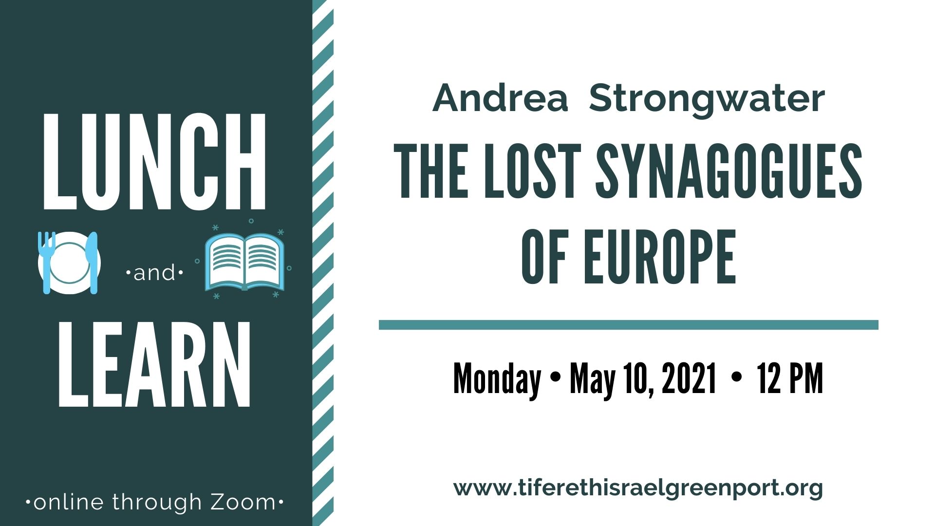 And now, Andrea Strongwater is coming to Lunch and Learn to talk about her research, the images she has painted, her award-winning book for young adults, and the fuller version depicting 80 lost synagogues, currently in progress.