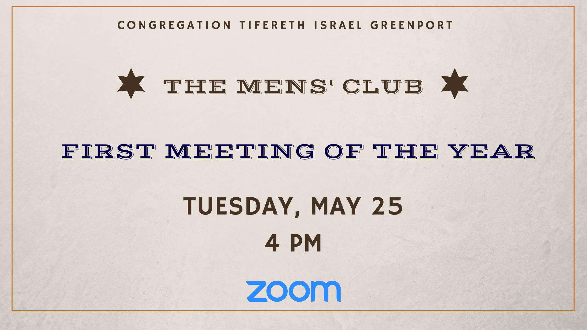 We are having our first meeting of this year on Tuesday, May, 25, at 4:00 PM. Because of ongoing social distancing directives, this meeting will be held through the Temple’s ZOOM account. Just go to the Tifereth Israel website, click on the “Shabbat Services or a Meeting Online link. Enter the code (same as for services) and you will be admitted.