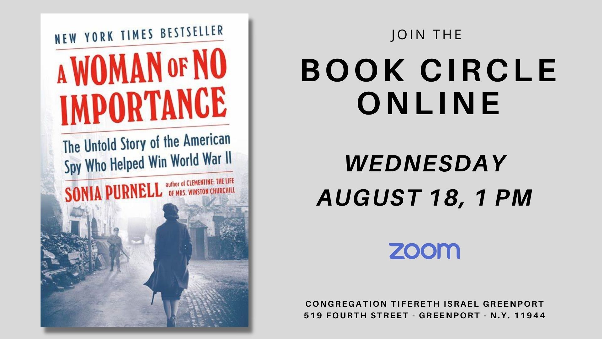 The Book Circle will meet Wednesday, August 18, at 1 p.m. on Zoom, to talk about Sonia Purnell’s spy story, A Woman of No Importance. The story revolves around Virginia Hall, a Baltimore socialite, who became the first Allied woman deployed behind enemy lines. She began by helping the French Resistance, in the process revolutionizing modern secret warfare. Later, her guerilla campaign saved many from the Nazis.