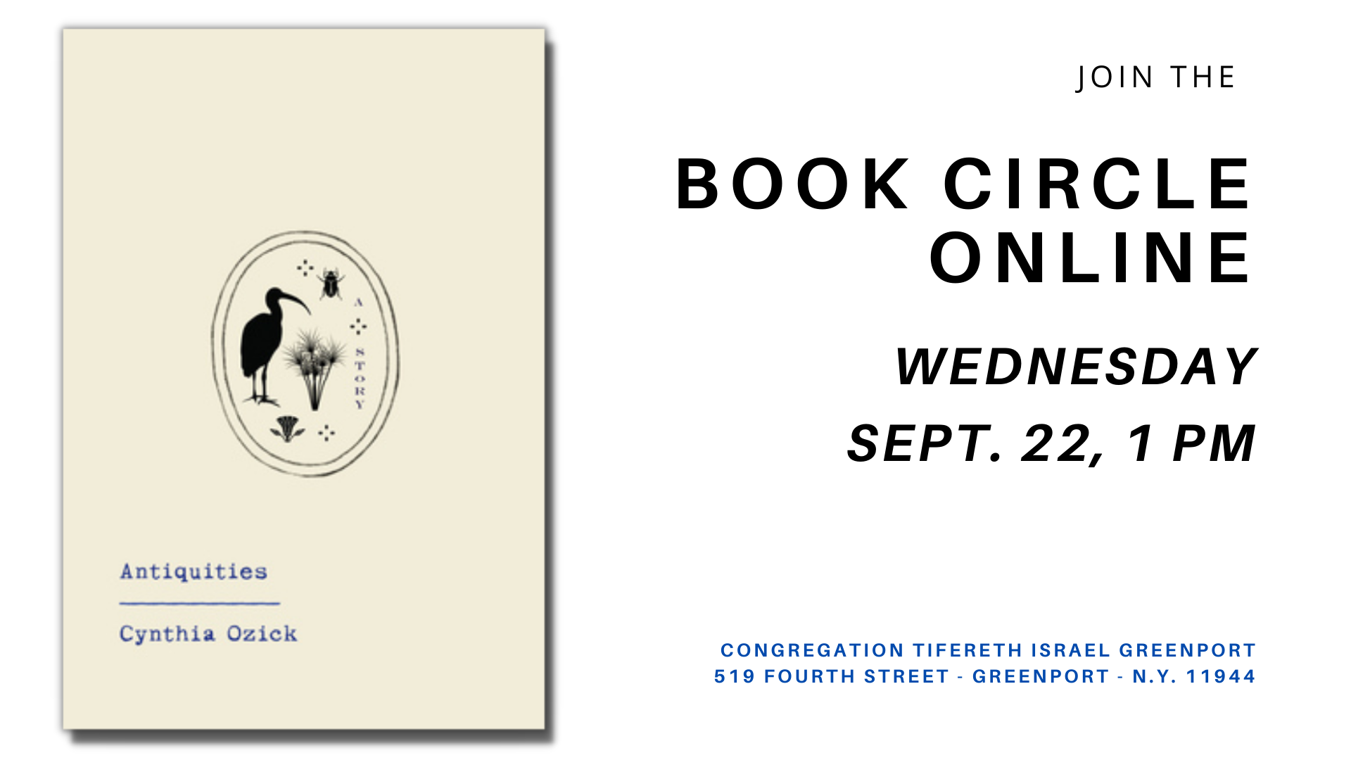 The Book Circle will meet Wednesday, Sept. 22, at 1 p.m., possibly in person, to talk about Cynthia Ozick’s latest masterwork, Antiquities. From one of our most preeminent writers comes a tale that captures the shifting meanings of the past, and how our own experiences color those meanings. Meet Lloyd Wilkinson Petrie, who is preparing a memoir of his days at the now-defunct Temple Academy for Boys. As he navigates the past and the present, he reconstructs the passions of a childhood encounter. Cynthia Ozick is a recipient of the PEN/Nabokov Award and the PEN/Malamud Award for fiction, and is a National Book Critics Circle winner for criticism.