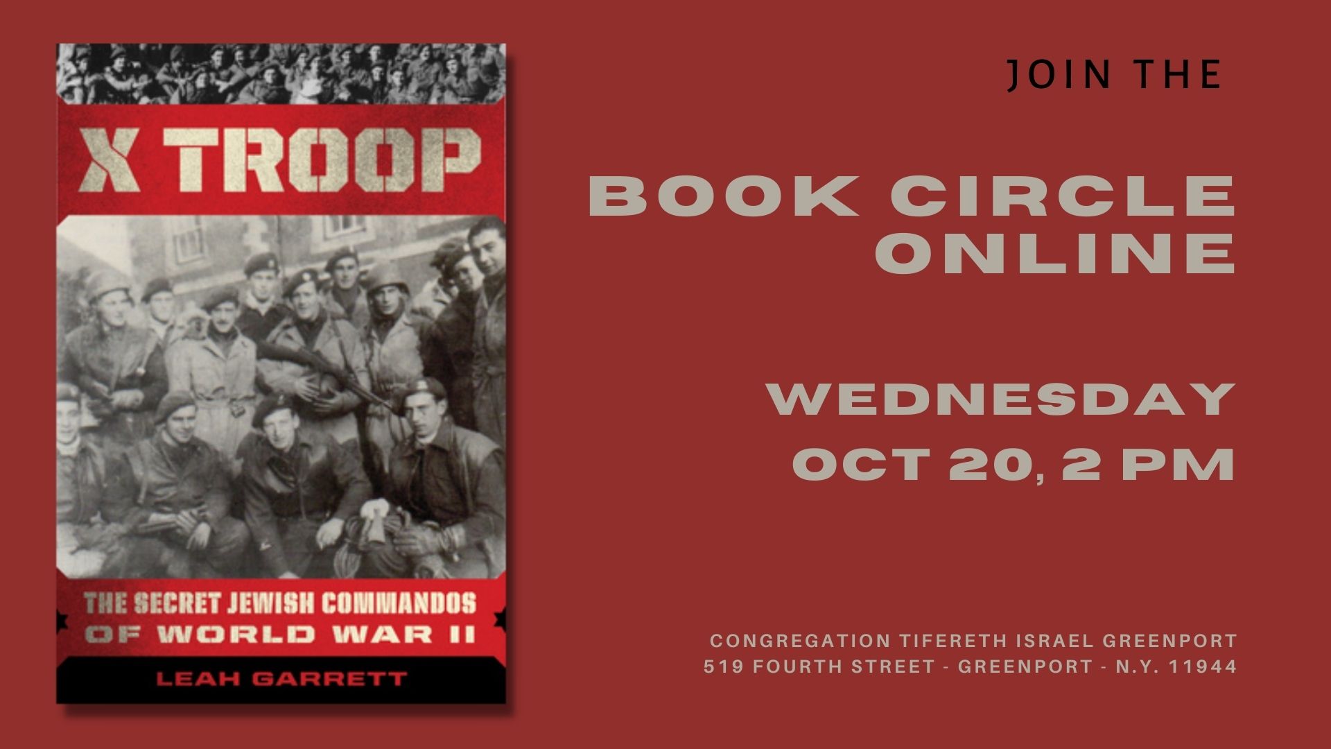 The Book Circle will meet on October 20, at 2 PM, to unveil the WWII saga of the German-Jewish commandos who fought in Britain’s most secretive special-forces unit. The commandos — actually Jewish refugees who have escaped to Britain — will stop at nothing to thwart the Nazis. Trained in counterintelligence and advanced combat, this top secret unit becomes known as X Troop.