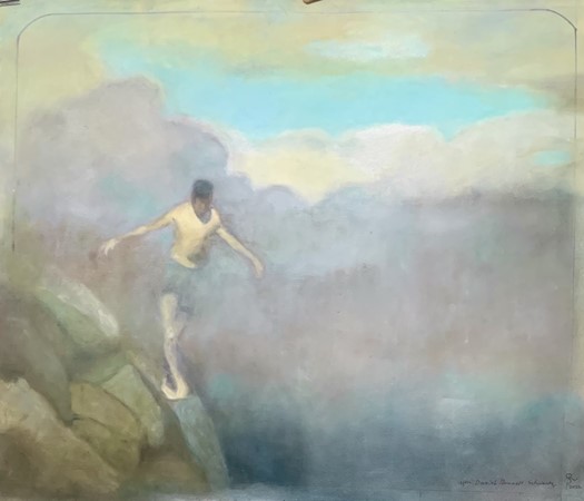 Coming upon the unfinished work recently, he experienced a eureka moment — that the piece speaks to the mood of the pandemic — that we, too, are in a tense situation, but by staying alert and focused, we will not fall into the abyss. Saul added the final brush strokes, and signed his painting in the convention of copied works: “After Daniel Bennett Schwartz, then added his own signature.