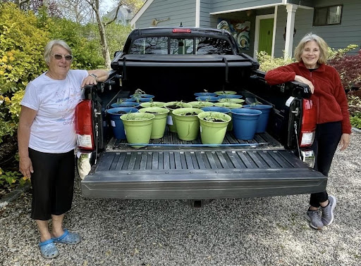 Cookie Slade, left, and Veronica Kaliski of the shul’s Tikkun Olam group potted and brought 20 tomato plants to the food pantry at CAST’s Southold headquarters. The plants, grown by Cookie from seeds, are distributed to CAST’s clients, who grow and nurture them at their homes for fresh veggies throughout the summer and early fall. Shul members wanting to participate in nurturing plants for CAST or the Common Ground garden can email the shul with a message for Veronica or Cookie.