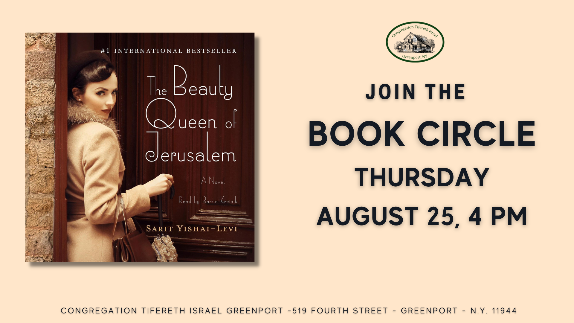 For its next meeting, the Book Circle has chosen The Beauty Queen of Jerusalem by Sarit Yishai-Levi. The group will gather on Thursday, August 25, at 4 p.m., in the community room of the synagogue.