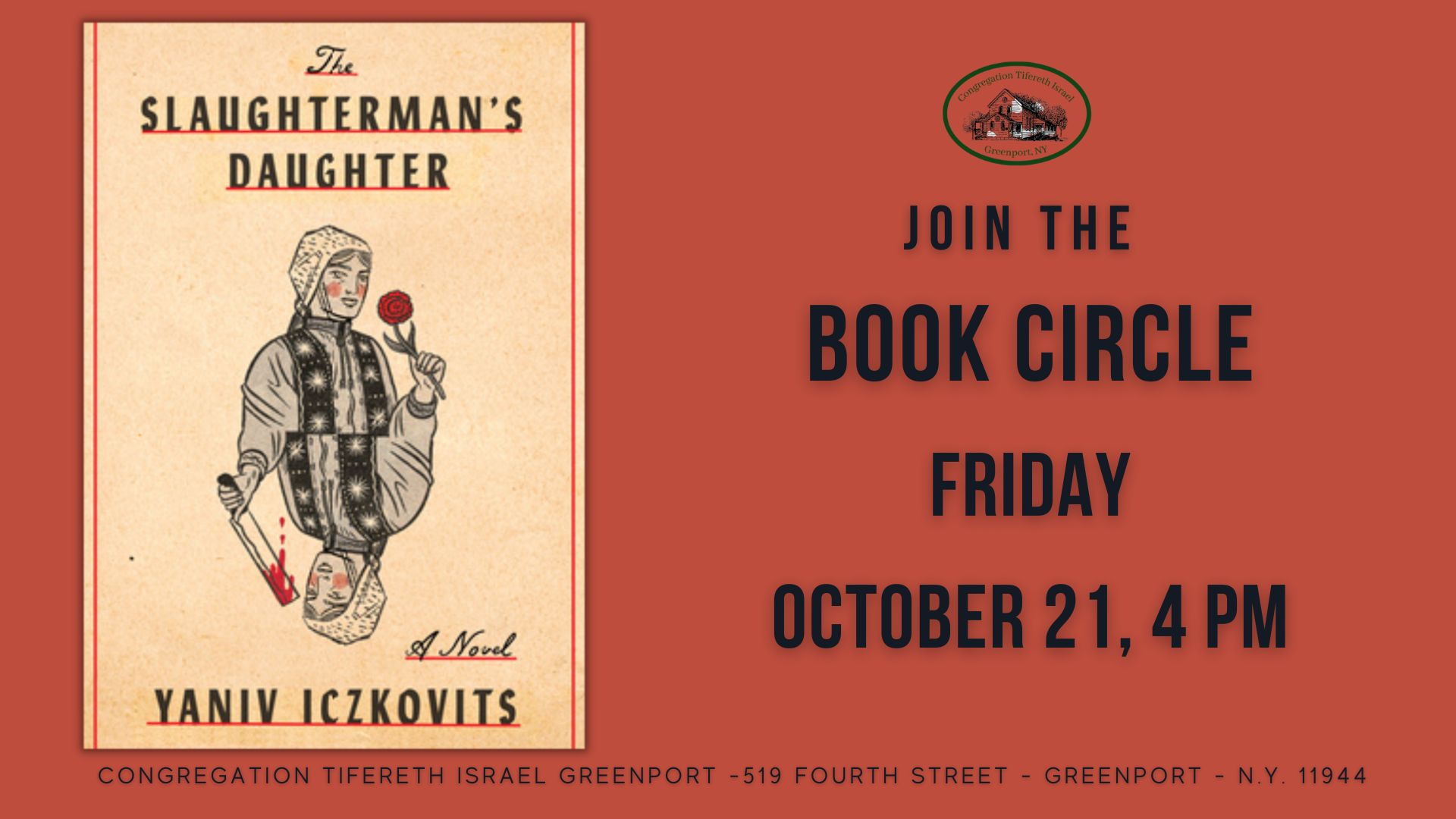 The Book Circle will meet on Friday, Oct. 21, at 4 p.m., at the shul, to explore a prize-winning family drama by Yaniv Iczkovits titled The Slaughterman’s Daughter, winner of the 2021 Wingate Prize and a finalist for a 2021 National Jewish Book Club Award.