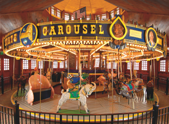 The carousel, which is 36 feet wide and 23 feet high, was built with the help of about 1,000 volunteer carvers, woodworkers, painters and quilters.
