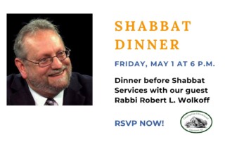 Shabbat Dinner with Rabbi Robert L. Wolkoff, Friday, May 1, at 6 p.m.