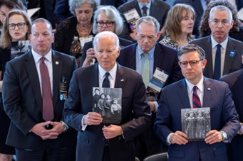 Left photo, people attend the annual Holocaust remembrance event, the “March of the Living” in memory of the six million Holocaust victims at the Auschwitz-Birkenau death camp in Oswiecim, Poland on May 6, 2024. On the right, President Joe Biden and Speaker of the House Mike Johnson stand to honor the memory of the six million during the annual Days of Remembrance ceremony at the Capitol in Washington on May 7.