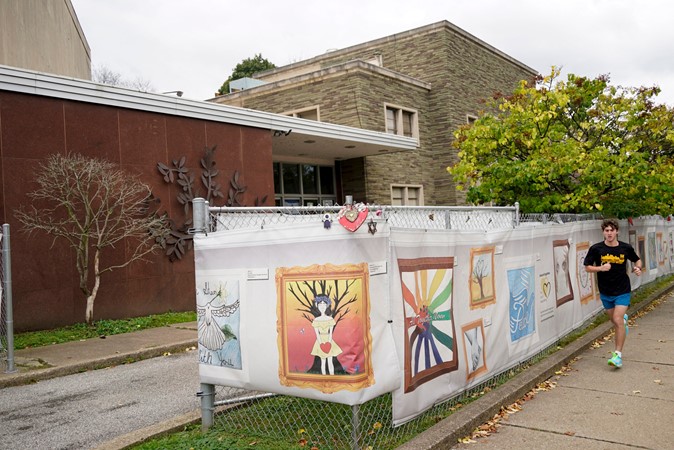 On Oct. 16, 2021, three years after 11 people were killed at the Tree of Life Synagogue in Pittsburgh’s Squirrel Hill neighborhood, a man jogs along the fencing outside the dormant building, decorated with artwork submitted by Pittsburgh area school students. Renowned architect Daniel Libeskind is among those working to transform the site to share space with the Holocaust Center of Pittsburgh. AP Photo/Keith Srakocic