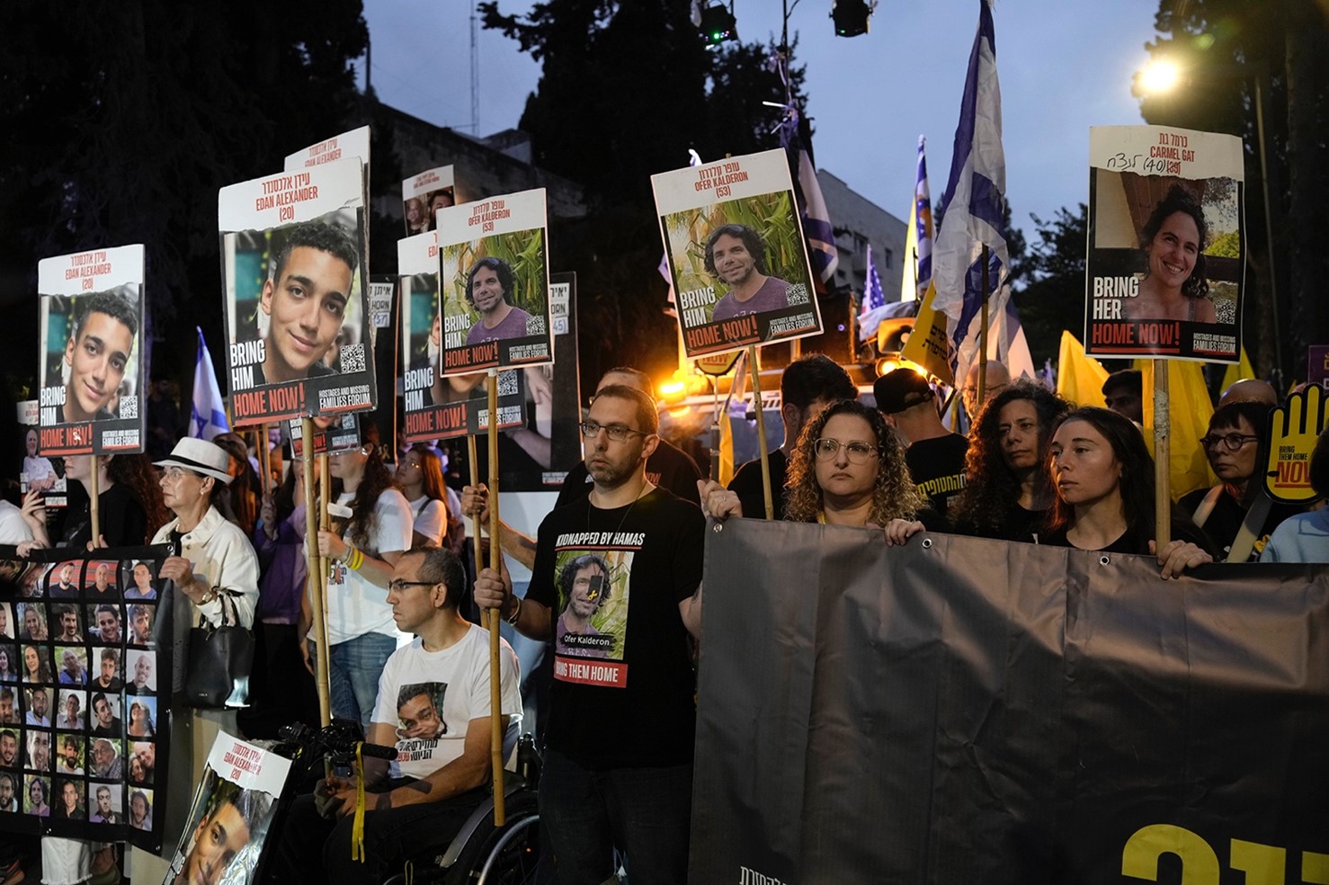 Jerusalem, top photo, people protested outside Prime Minister Benjamin Netanyahu’s house on the one- year anniversary of the Hamas attack on Israel and called for the release of hostages held by Hamas.