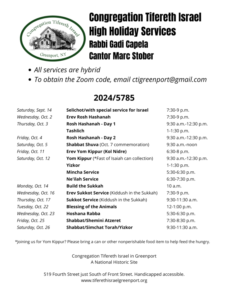 The synagogue is located at 519 Fourth Street, Greenport. All are welcome to worship throughout the High Holidays.