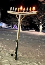 It was snowing all day, and then it wasn’t. But it was cold. We didn’t care. We gathered in Mitchell Park at 5 p.m., on Dec. 14, and Rabbi Howard Diamond led the prayers before we welcomed Hanukkah by lighting the “candle” on the first of the eight nights of the holiday. An ecumenical spirit filled the park as Christmas lights glowed in the background. Back at the shul, latkes were heating in the kitchen, vodka was plentiful on the refreshments table, and the band was tuning up. There were dreidels and chocolate coins, decorations around the community room, and friends and neighbors joining shul members in the spirit of good will. It was a grand night of celebration. SMBloom photos